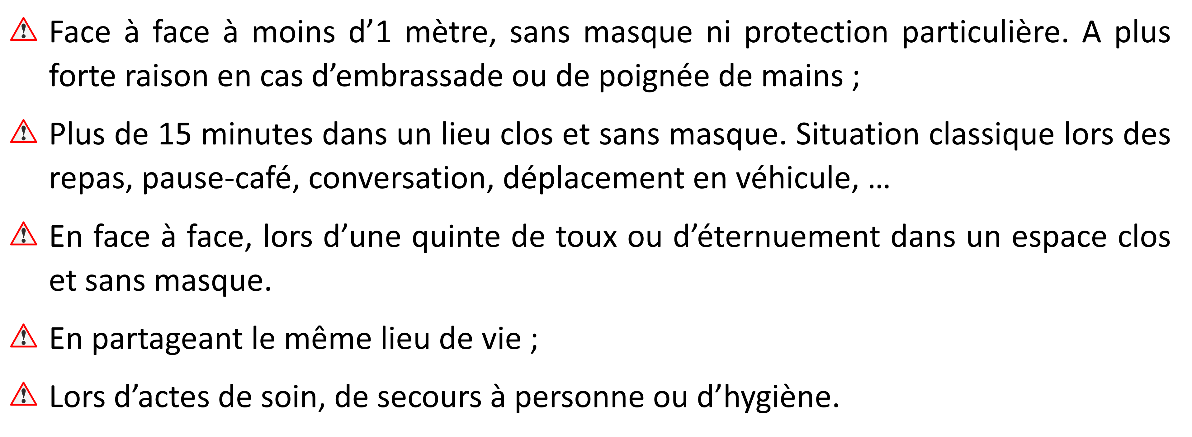 Vous devenez « cas contact » si vous vous êtes trouvé en relation avec une personne porteuse du covid-19 dans l’une ou l’autre des situations suivantes.
