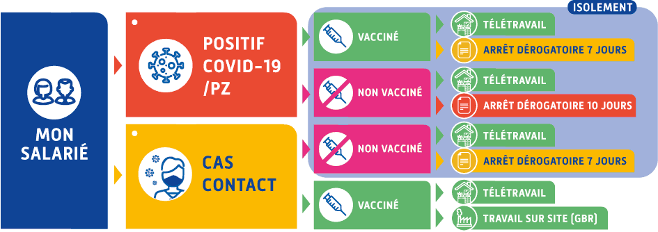 Les cas contact non-vaccinés doivent s’isoler immédiatement dès qu’ils en ont connaissance (quarantaine) et effectuer un test dans les 48 heures. Faute de pouvoir télétravailler, ils sont placés en arrêt travail par l’Assurance Maladie, qui leur délivre un arrêt de travail sans jour de carence. Cet arrêt de travail est rétroactif.